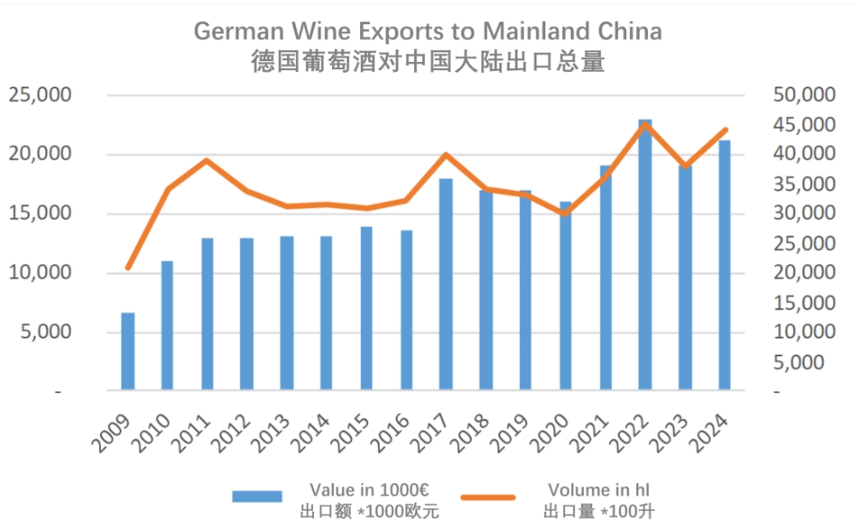 针对中国市场,德国葡萄酒在中国的进口额和进口量整体稳中有升,过去15年间,德国对中国大陆葡萄酒出口表现显著提升,出口额增幅高达3.24倍,从655万欧元增至2124万欧元;出口量由210万升上升至442万升,增长2.1倍。