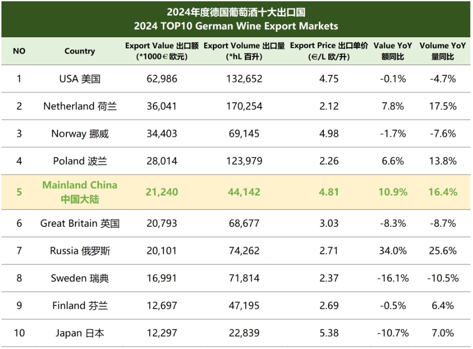 2024年,中国大陆成为德国葡萄酒第五大出口市场,出口量增长16.4%,出口额增长10.9%。此外,出口均价达4.81欧/升,在前十大出口国中排名第三,均价仅次于日本和挪威。