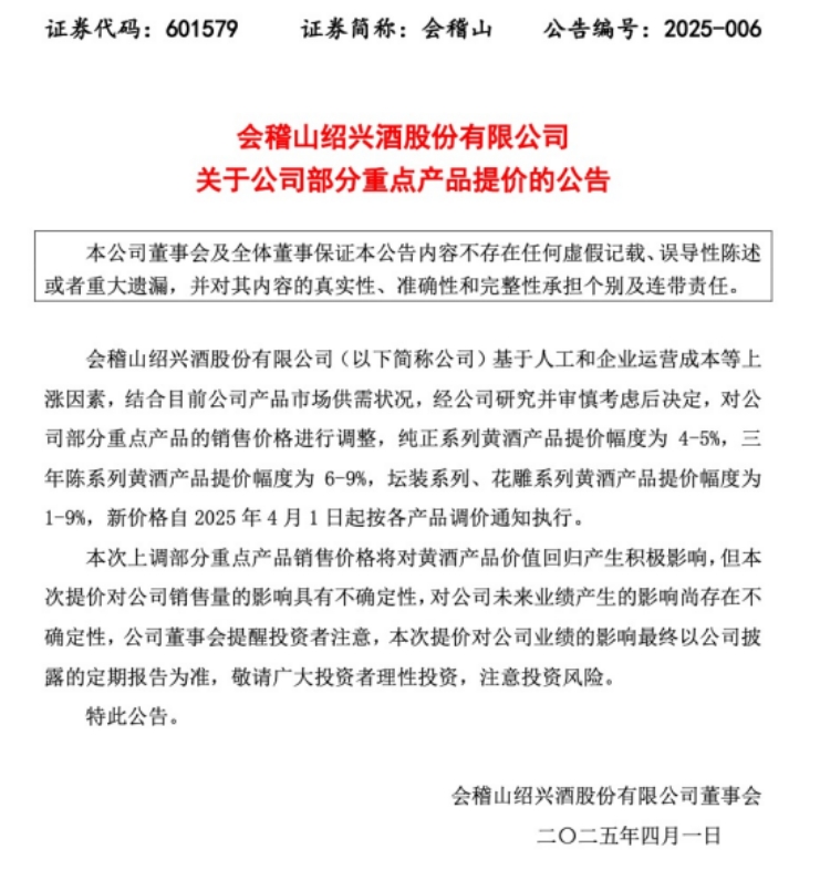 其中,纯正系列黄酒产品提价幅度为 4-5%,三年陈系列黄酒产品提价幅度为 6-9%,坛装系列、花雕系列黄酒产品提价幅度为 1-9%,新价格自 2025 年 4 月 1 日起按各产品调价通知执行。