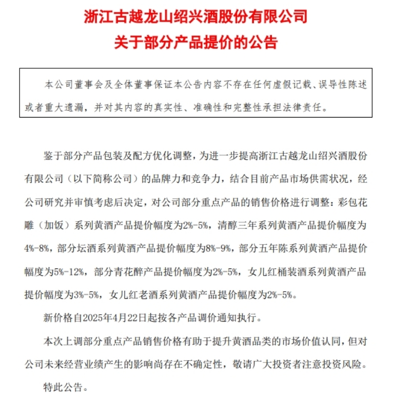 4月1日,古越龙山(600059.SH)发布公告,公司将对部分重点产品的销售价格进行调整。新价格将自2025年4月22日起按各产品调价通知执行。