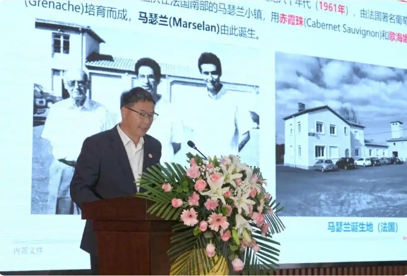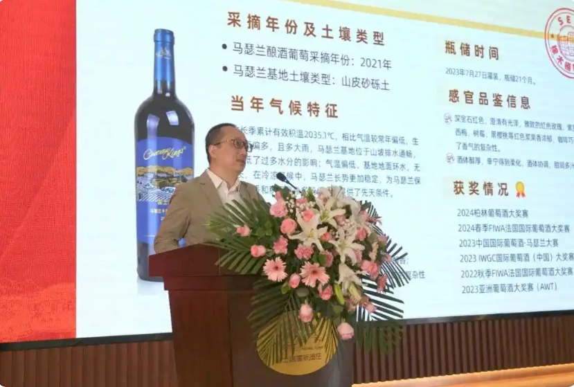 会上,金士通国际酒庄常务副总经理兼总工程师余东亮就马瑟兰的品种起源、全球种植趋势及未来发展潜力进行了深度解析,详细讲述了马瑟兰之父保罗·特鲁尔的培育历程,以及这一品种如何凭借其独特的抗病性和酿造潜力,成为全球酿酒师的新宠,并分享了酒庄在马瑟兰葡萄培育方面的专业经验与创新成果。