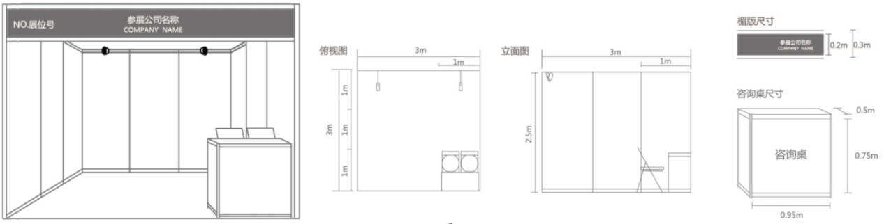 (1)标准展台采用国际标准展架,铝合金构架,三面展墙,中、外文楣板字,两只射灯,一张洽谈桌,两把椅子,一个220V/5A/400W电源插座。
