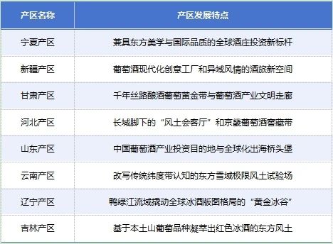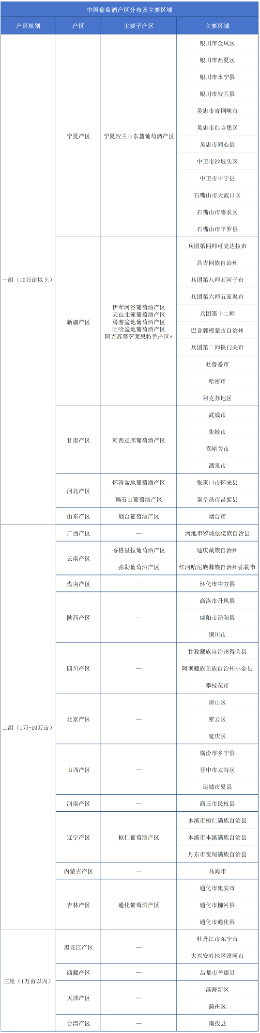 从地理空间和产业规模来看,我国8大葡萄酒产区、13个主要子产区呈现“一带两翼多点”分布格局。东起山东产区,西至宁夏、新疆产区,集中了5个10万亩以上产区,是酿酒葡萄黄金种植区和葡萄酒规模生产区叠加地带;西南高山地区和东北严寒地区3个1万至10万亩产区则构成了特色葡萄酒生产的“两翼”区域。“多点”是指20个省(区)具有地方特色的酿酒葡萄种植基地和葡萄酒酿造酒庄星罗棋布。