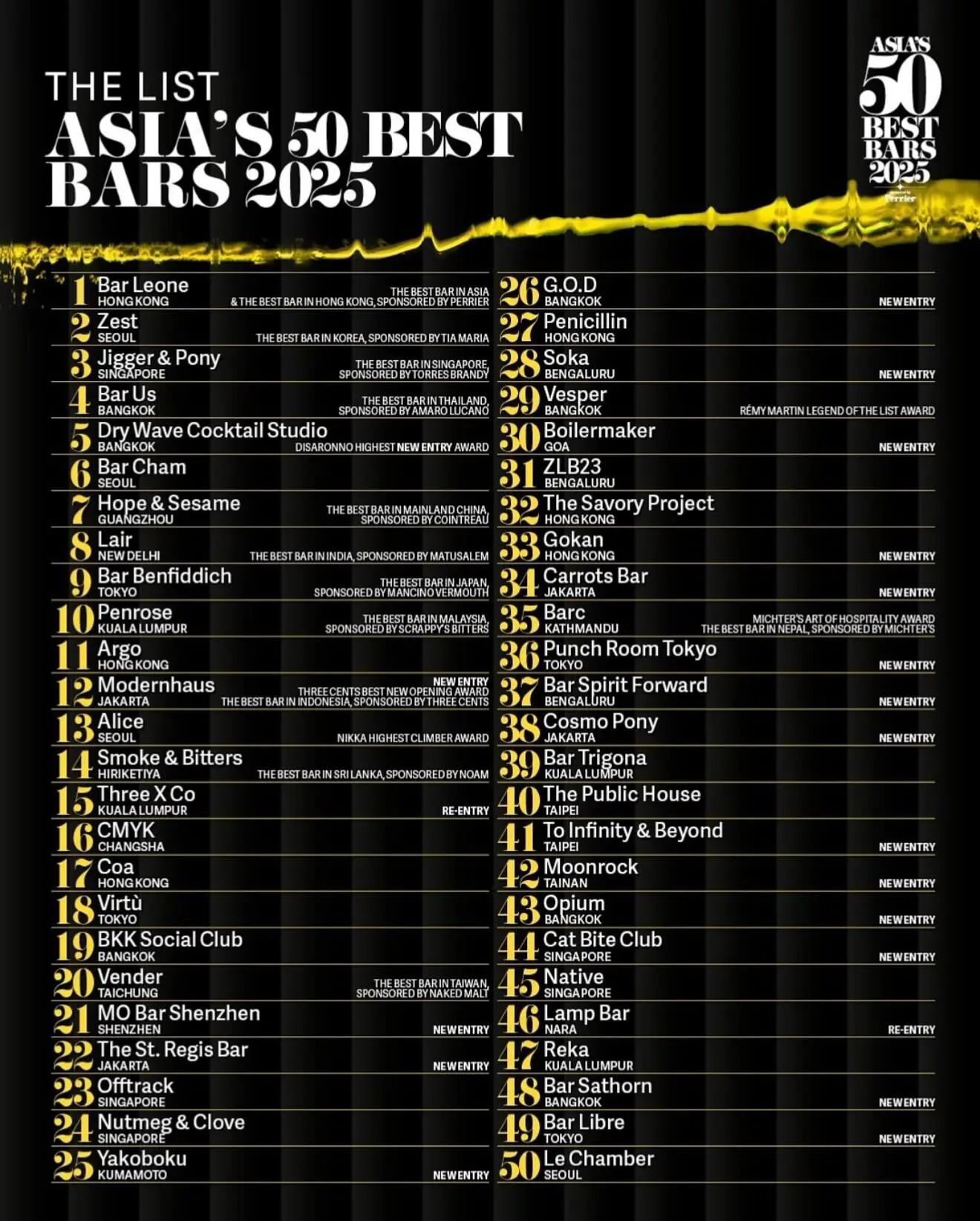 前三名与去年一致,第一名为中国香港的酒吧Bar Leone,首尔Zest荣获第二名,第三名则是来自新加坡的Jigger & Pony,榜单有超过1/3新增酒吧!