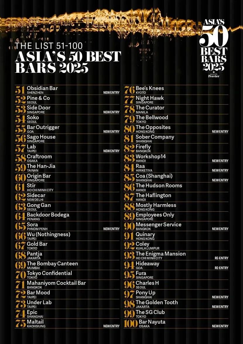 在此榜单发布之前,主办方公布了第51-100扩展榜单,其中,中国大陆及港澳台地区共有14家酒吧上榜,内地5家:深圳Obsidian Bar、上海Epic、上海Sober Company、上海Coa、上海Pony Up;台湾地区6家:台北Lab、台北Wu、台北Bar Mood、台北Under Lab、台南The Han-Jia、高雄Maltail;香港地区3家:The Opposites、Mostly Harmless、Quinary。