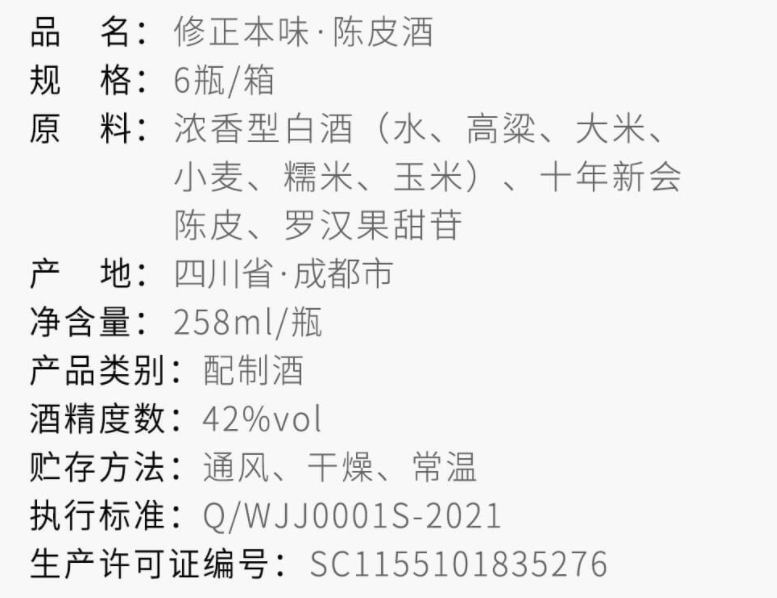 9月16日,修正发布消息,修正本味陈皮酒正式上市发售,该酒打造药食同源理念,为42度花果型浓香配制酒,基酒采用来自四川邛崃五粮白酒产区,精选十年新会陈皮和罗汉果甜苷入酒。陈皮的橘香融入酒中,降低了白酒的辛辣之味,为传统浓香川酒,增添了一丝清雅。