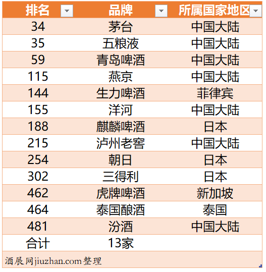 下面把亚洲品牌500强中酒类品牌罗列如下: