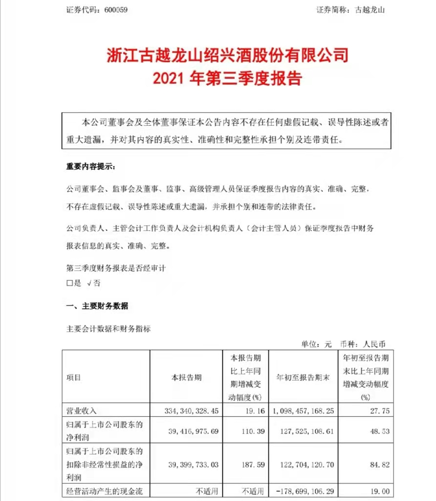 10月22日,浙江古越龙山绍兴酒股份有限公司(以下简称“古越龙山”)发布2021 年第三季度报告。报告数据显示,古越龙山从年初至报告期末实现营业收入10.98亿元,同比增长27.75%;归属于上市公司股东的净利润1.28亿元,同比增长48.53%。仅第三季度实现营业收入3.34亿元,同比增长19.16%;归属于上市公司股东的净利润0.39亿元,同比增长110.39%。