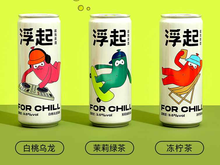 浮起起泡茶酒主打“微醺果茶,气泡小酒”,推出了白桃乌龙、茉莉绿茶、冻柠茶三种口味,酒精度数为3.5%Vol。