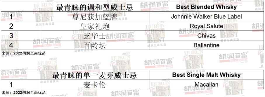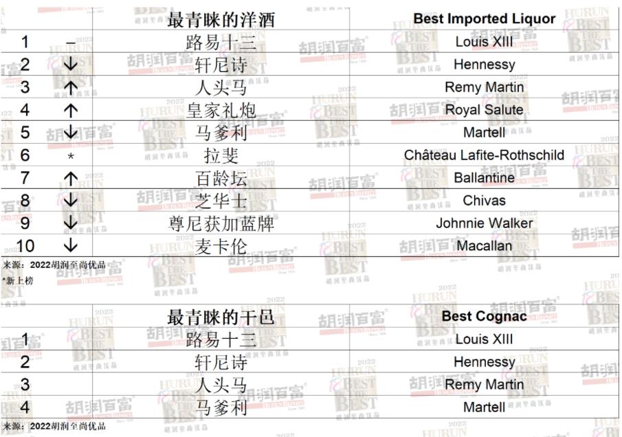 2022年01月20日,胡润研究院发布《2022胡润至尚优品—中国高净值人群品牌倾向报告》,报告评选了最受青睐的酒类品牌,其中路易十三蝉联最青睐的洋酒品牌第一名,轩尼诗和人头马分别排在第二和第三名。路易十三同时当选最青睐的干邑品牌。尊尼获加蓝牌当选最青睐的调和型威士忌品牌第一名,皇家礼炮和芝华士分别排在第二和第三。