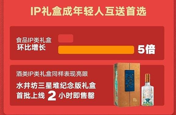 国潮文创产品兴起,IP跨界联名产品受到年轻人喜爱,报告显示水井坊三星堆纪念版礼盒首批上线2小时即售罄,证明年轻群体具有强劲的消费潜力。