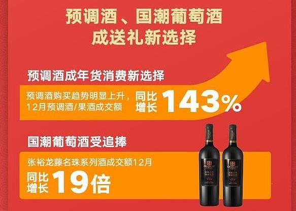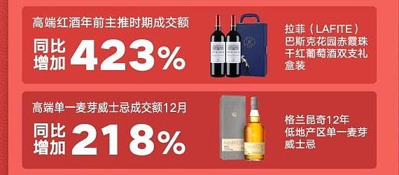 春节聚餐多,也是用酒的高峰期,年轻群体成为网销的主力军,他们青睐的预调制酒、果酒等新式潮饮开始走俏。高端红酒成交额同比增加423%,拉菲、巴斯克花园赤霞珠干红葡萄酒成为主推产品。单一麦芽威士忌成交额12月同比增加218%,格兰昆奇成为主推产品。