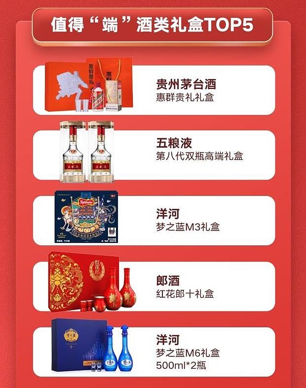 京东超市12月酒类礼盒销量排名TOP5中,排名前五的依次是贵州茅台惠群贵礼礼盒、五粮液第八代双瓶高端礼盒、洋河梦之蓝M3礼盒、郎酒红花郎十礼盒、洋河梦6礼盒。