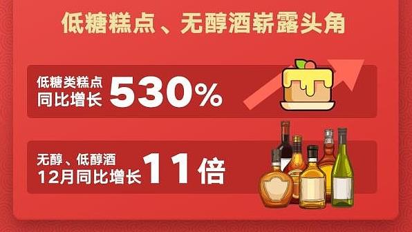送礼送健康成为孝敬长辈的趋势。报告显示,养生类礼盒产品销量增加153%,其中,无酒精低酒精度越来越符合年轻群体的消费观念,无醇、低醇酒销量12月同比增长达11倍。