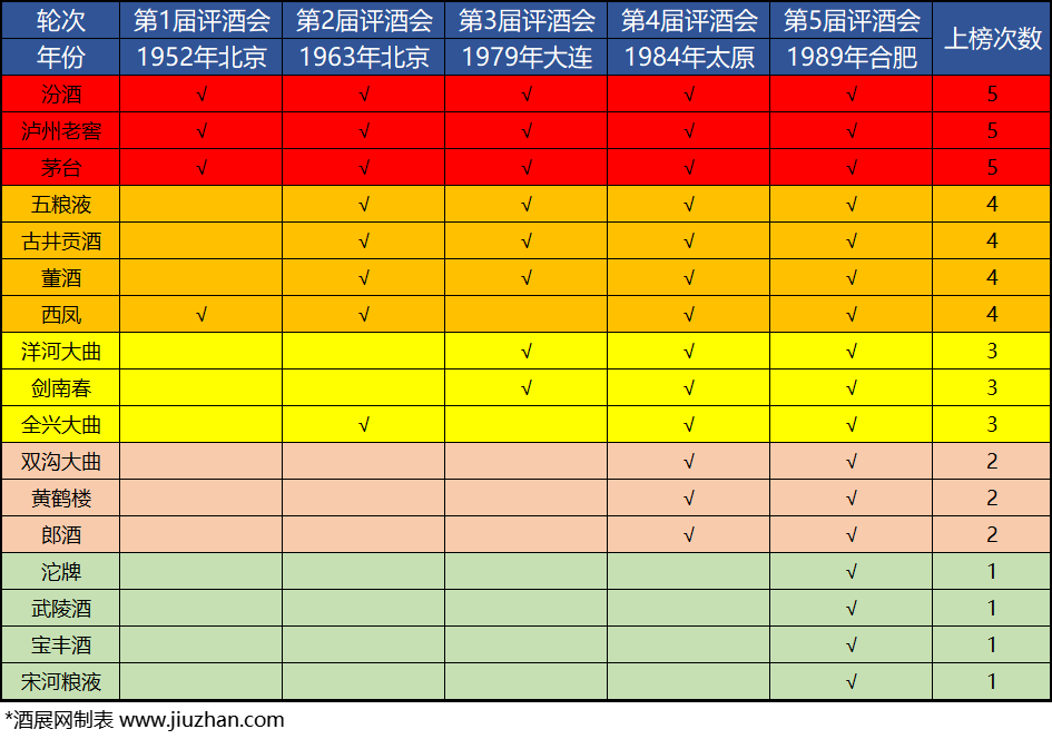 根据五次评酒会的评选结果,我们看到五次同时进入国家名酒行列的是清香型的汾酒、浓香型的泸州老窖、酱香的茅台,这三个品牌成为所属香型的巅峰代表,也奠定了他们在中国白酒乃至世界烈酒中的地位。