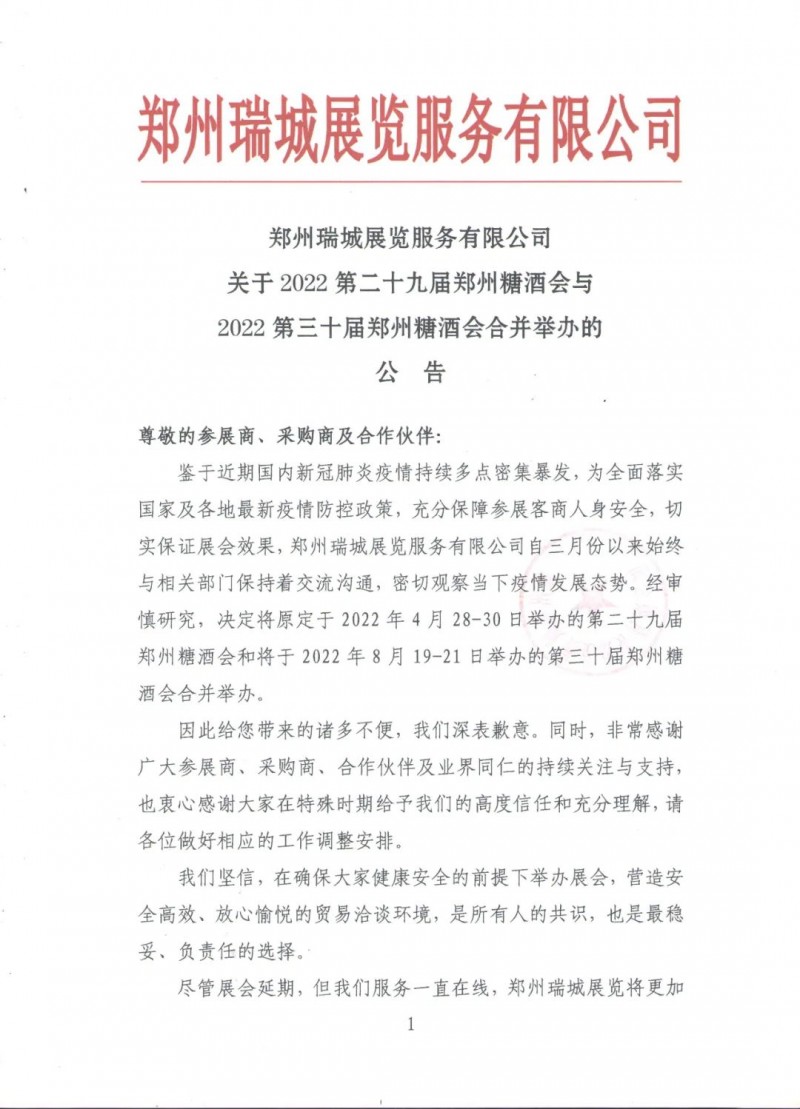 鉴于近期国内新冠肺炎疫情持续多点密集暴发,为全面落实国家及各地最新疫情防控政策,充分保障参展客商人身安全,切实保证展会效果,郑州瑞城展览服务有限公司自三月份以来始终与相关部门保持着交流沟通,密切观察当下疫情发展态势。经审慎研究,决定将原定于2022年4月28-30日举办的第二十九届郑州糖酒会和将于2022年8月19-21日举办的第三十届郑州糖酒会合并举办。