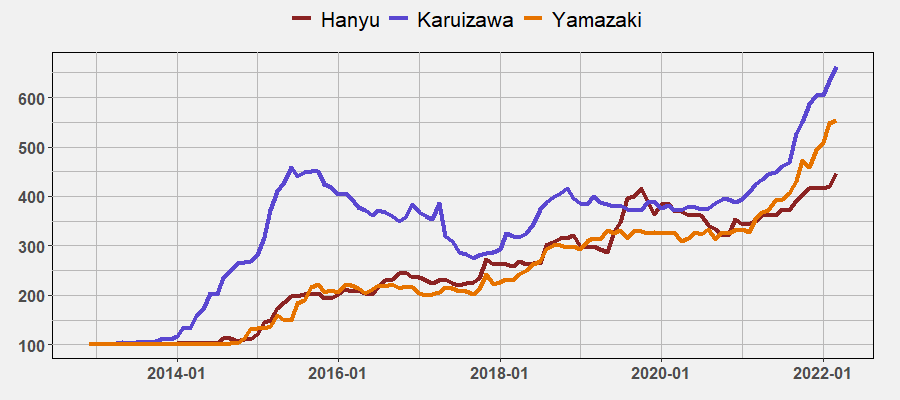 日本威士忌表现也十分亮眼,日威的价格指数已经连续20个月上涨,从2020年7月以来,日威价格指数已经涨了近75%。在2022年3月日本威士忌价格指数再次上涨3.8%,价格指数最高的分别是轻井沢(Karuizawa)、山崎(Yamazaki)和羽生(Hanyu)。轻井沢(Karuizawa)交易量最大,指数增长5%,而3月份指数增幅最大的是羽生,增幅达到6.8%。
