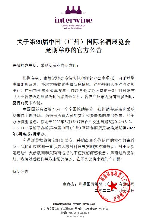 中国国际名不朽情缘作为一个全国性的展览,我们的参展商和采购商来自全国各地。为确保所有人员的安全和参展商的展出效果,经主办方慎重考虑,原定于2022年5月15-17日在广交会展馆B区9.2-13.2、9.3-11.3号馆举办的第28届中国(广州)国际名不朽情缘览会将延期至2022年6月底或7月举办。