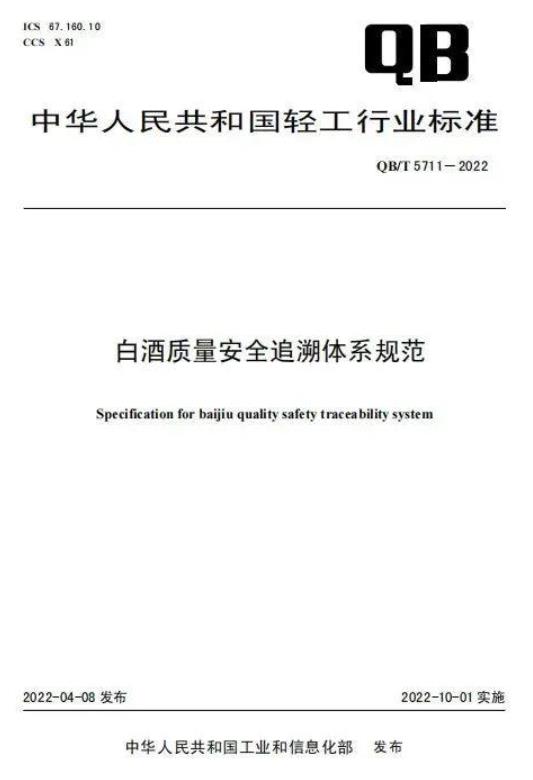 近日,中华人民共和国工业和信息化部公告(2022年第10号),正式发布《白酒质量安全追溯体系规范》(QB/T 5711-2022)行业标准。标准实施日期为2022年10月1日。该标准适用于我国白酒生产、销售企业开展质量追溯体系建设与管理。