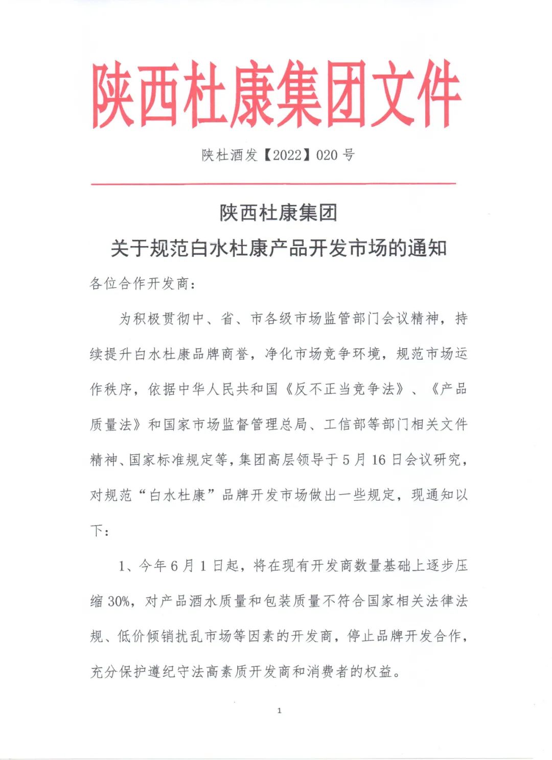 5月16日,本着进一步规范陕西白水杜康酒市场经营秩序,改善酒类市场消费环境,促进酒类市场健康有序的发展,维护消费者合法权益,让消费者喝上“放心酒”的原则,陕西杜康集团发布了《关于规范白水杜康产品开发市场的通知》。通知包含三点规范内容: