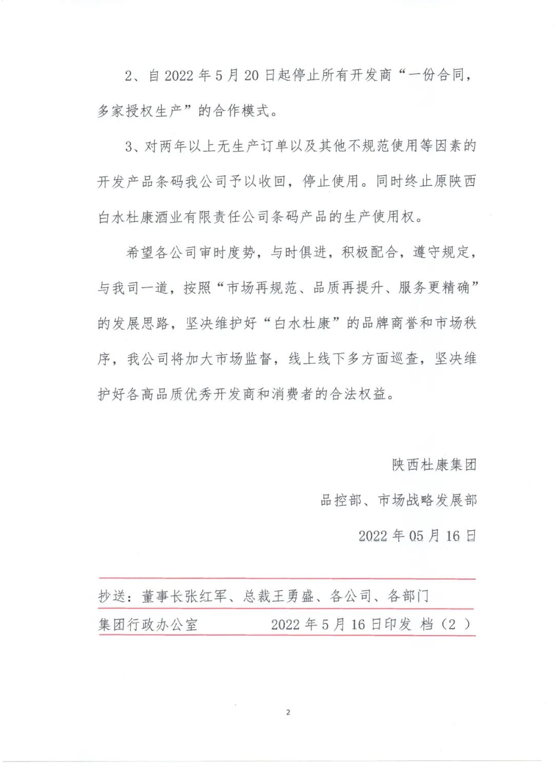 三、对两年以上无生产订单以及其他不规范使用等因素的开发产品条码予以收回,停止使用。同时终止原陕西白水杜康酒业有限责任公司条码产品的生产使用权。