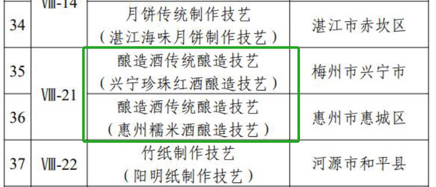 5月20日,广东省人民政府公布第八批省级非物质文化遗产代表性项目名录,其中涉及酿造酒传统酿造技艺两个项目入选,即兴宁珍珠红酒酿造技艺、惠州糯米酒酿造技艺。珍珠红酒酿造技艺是采用小曲发酵的米香型白酒,代表企业有广东明珠珍珠红酒业有限公司。