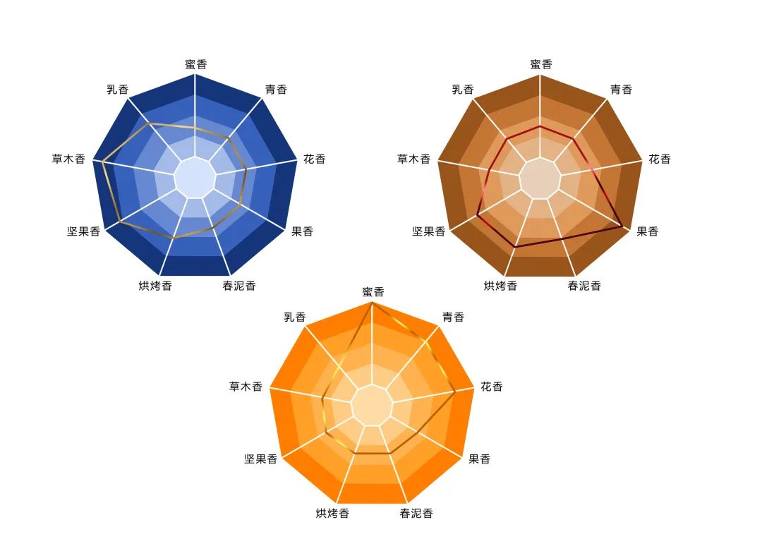 为了能让消费者对馥郁香的丰富口感有更直观的理解,中粮营养健康研究院绘制呈现出馥郁香“感官雷达图”,首次将其应用在“三生万物”产品上,以草木香、坚果香、烘烤香、春泥香、果香、花香、青香、蜜香、乳香等9大主要香气组成9大维度,并通过二维图形展示多维数据,精准呈现同一种香型三种风味的口感特质,更加科学立体地诠释产品特性,给人耳目一新的体验。