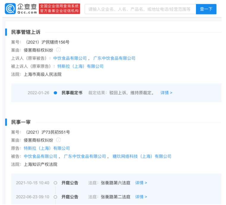 近日,企查查APP显示,特斯拉(上海)有限公司新增一条侵害商标权纠纷开庭公告。