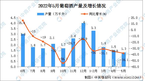2022年5月全国葡萄酒产量为1.3万千升,同比下降38.1%。2022年1-5月全国葡萄酒产量7.9万千升,同比下降31.3%。