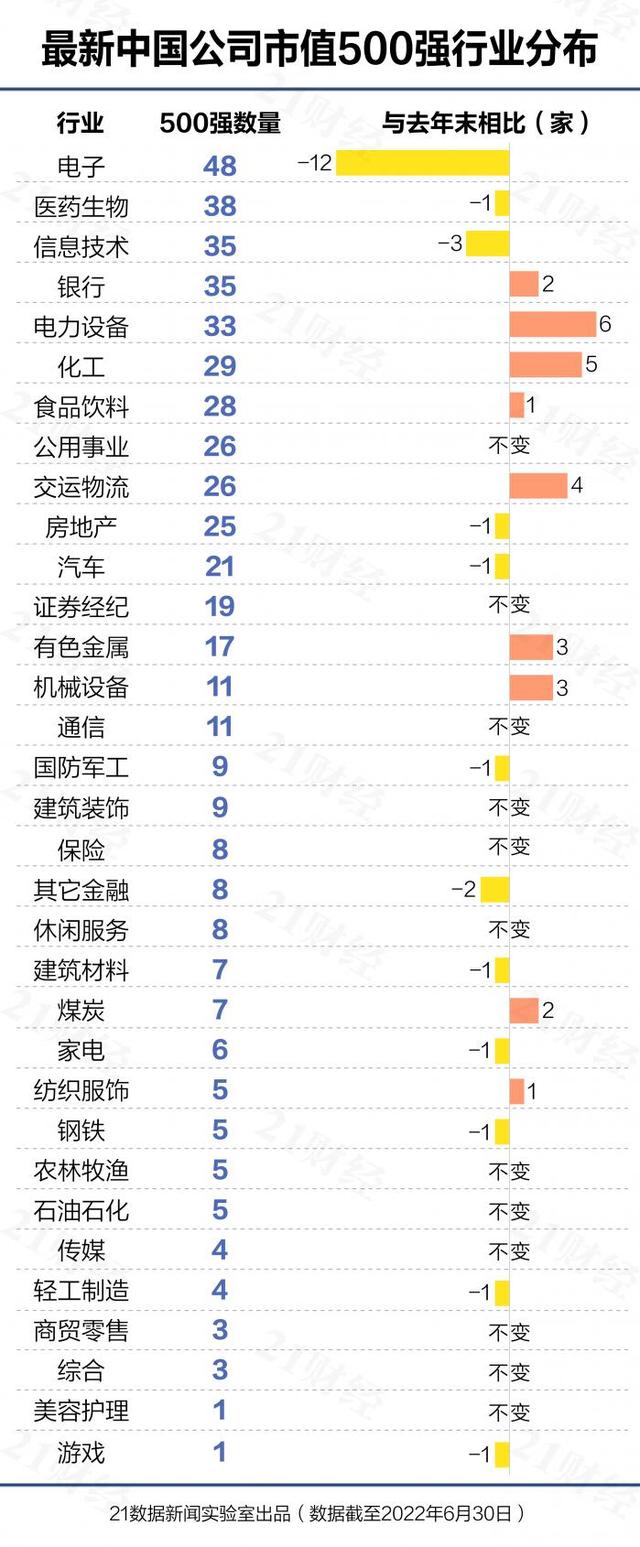 近日,21数据新闻实验室发布了中国上市公司市值500强名单。据统计,截至2022年6月30日,在上海、深圳、北京、香港、纽约等全球16个主要交易所上市的中国上市公司共计8392家(剔除已退市公司),相比去年年末增加116家。总市值130.22万亿元(人民币,下同),相比去年年末降低8%。