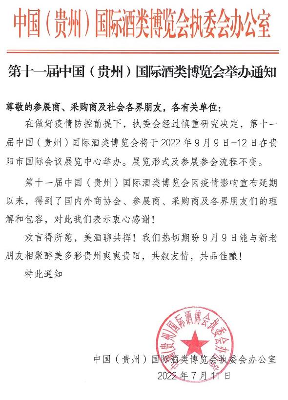 7月11日,中国(贵州)国际酒类博览会执委会办公室、贵州国际酒类博览会会展有限公司发布通知,第十一届中国(贵州)国际酒类博览会将于2022年9月9日-12日在贵阳市国际会议展览中心举办,展览形式及参会流程不变。