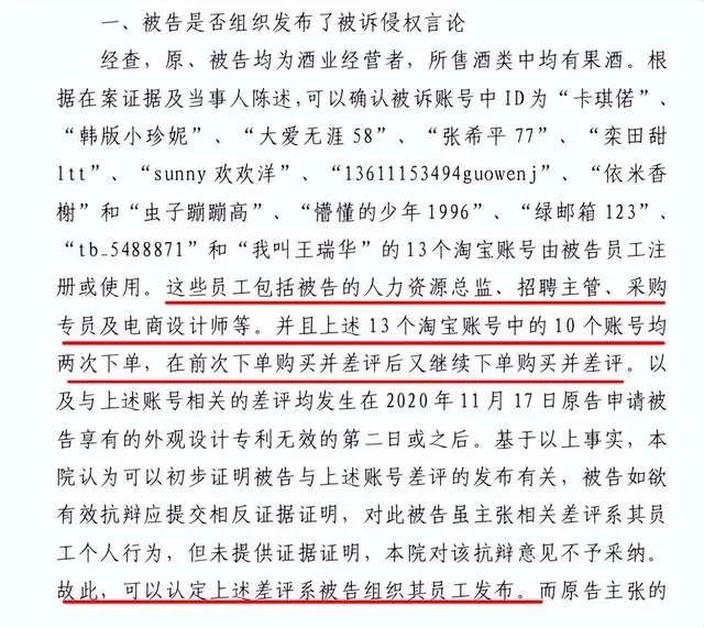 最终法院认定这些留言差评的账号中,有13个淘宝账号由醉鹅娘员工注册或使用的。并且这13个淘宝账号中的10个账号均两次下单,在前次下单购买并差评后又继续下单购买并差评。与上述账号相关的差评均发生在2020年11月17日落饮公司申请醉鹅娘公司享有的外观设计专利无效的第二天或之后。