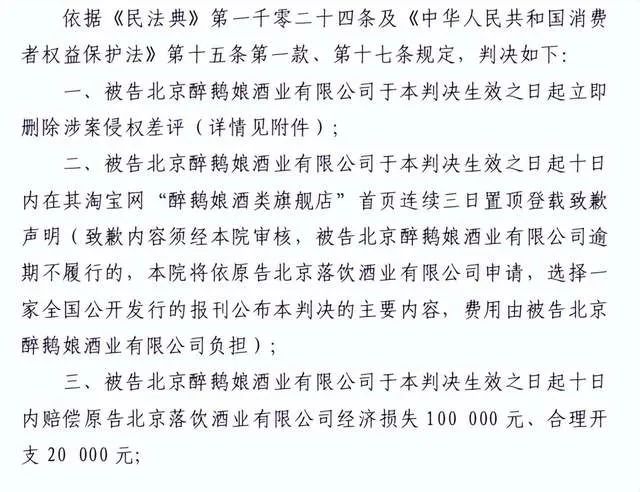 法院判定醉鹅娘公司需在判决生效之日起立即删除涉案的侵权差评,并且要在判决生效之日起10日内在其淘宝网“醉鹅娘酒类旗舰店”首页连续3日置顶登载对落饮公司的致歉声明。