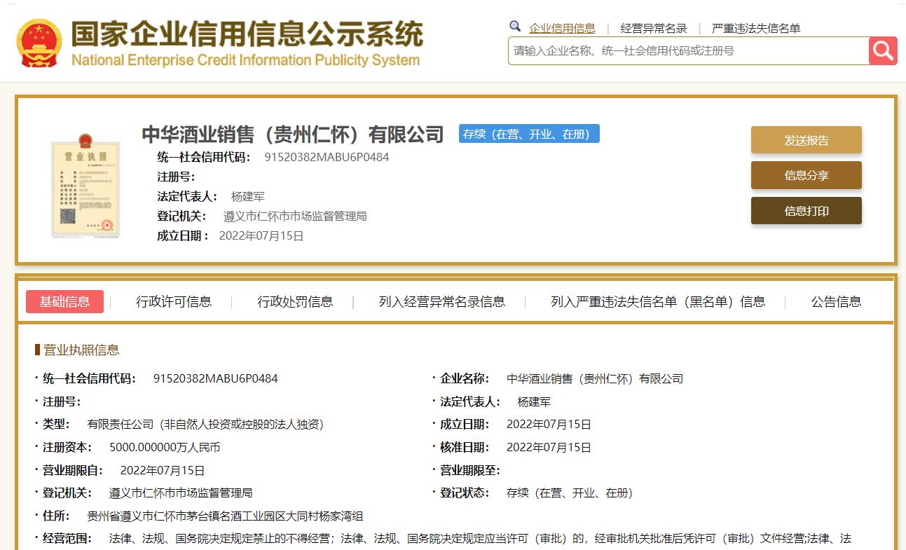 工商登记信息显示,7月15日,北京首都酒业有限公司新增两项对外投资,分别为中华酒业(贵州仁怀)有限公司和中华酒业销售(贵州仁怀)有限公司,注册资本分别为1000万元和5000万元,由首都酒业100%控股,法定代表人为杨建军,注册地点位于贵州省遵义市仁怀市茅台镇名酒工业园区。