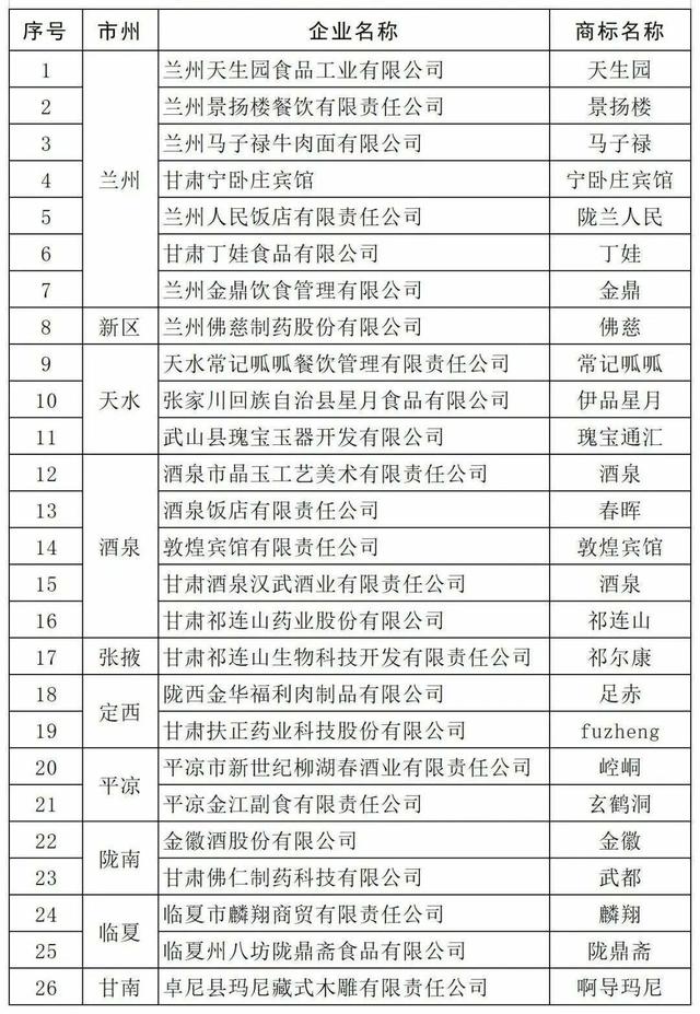 8月12日,经各地商务主管部门推荐、专家组评审和会议研究,甘肃省商务厅决定将金徽酒股份有限公司等26家企业(品牌)认定为首批“甘肃老字号”。有三家酒企入选该名单,分别是甘肃酒泉汉武酒业有限责任公司、平凉市新世纪柳湖春酒业有限责任公司、陇南金徽酒股份有限公司。