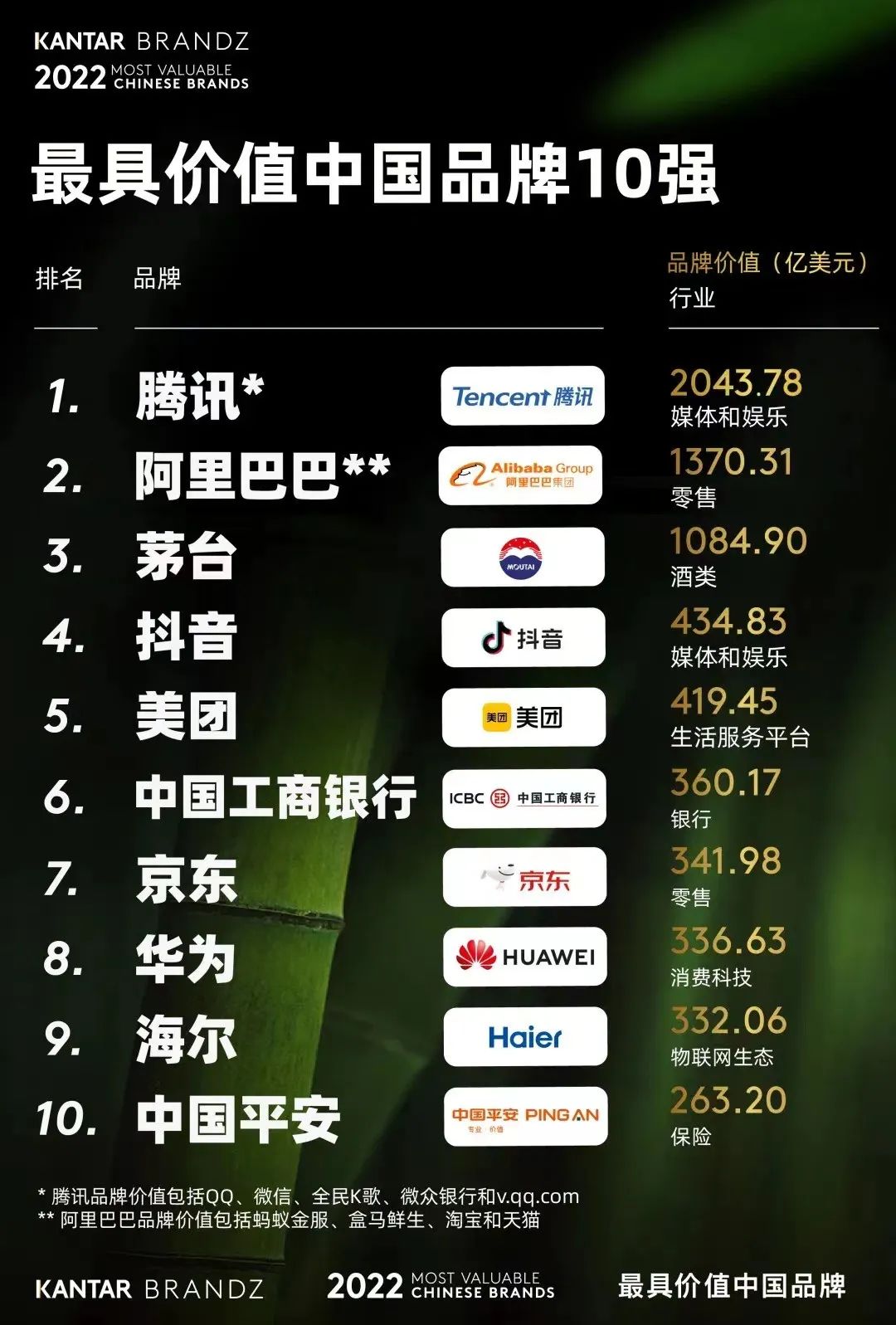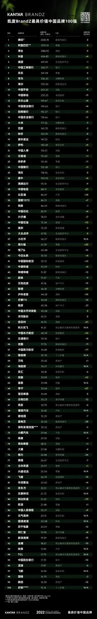 图源/2022年度凯度BrandZ最具价值中国品牌100强榜单