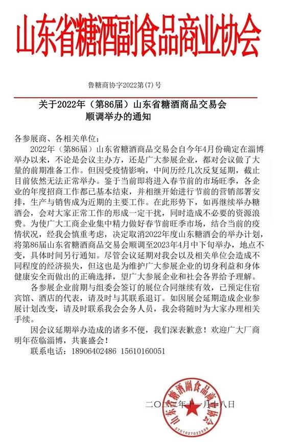 11月18日,山东省糖酒副食品商业协会发布通知,结合当前的疫情状况,决定将第86届山东省糖酒商品交易会顺调至2023年4月中下旬举办,地点不变(山东省淄博市),具体时间另行通知。