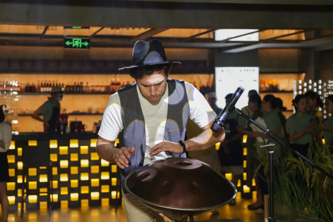 在“越王台”的中央区域,则陈列了当红爆款“只此青绿 只此青玉”联名款,以及与舞蹈诗剧《只此青绿》相关的装饰品。而旁边为一缕射灯在地面投影出一个硕大的 “慢”字,显示酒馆的主题。