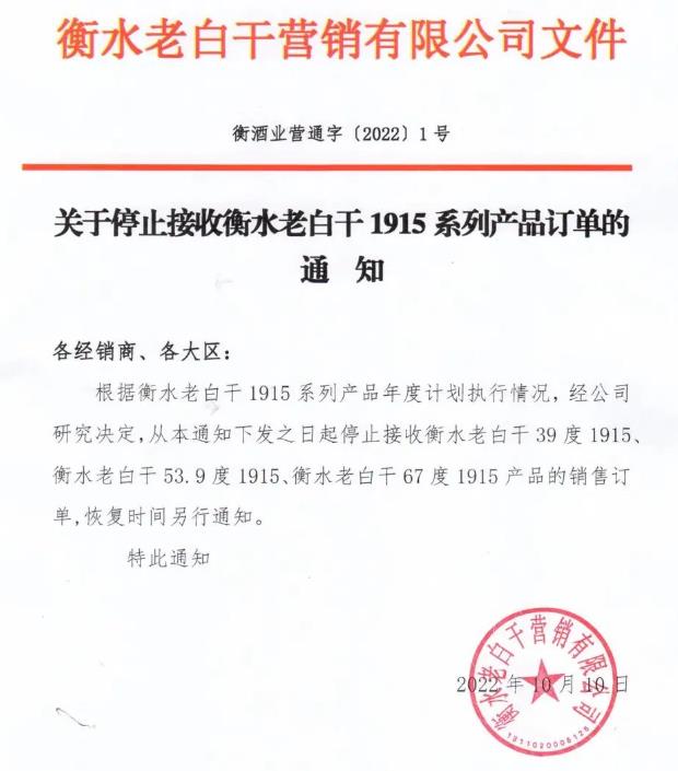 10月10日,衡水老白干营销有限公司发布《关于停止接收衡水老白干1915系列产品订单的通知》。通知显示,经公司研究决定,从本通知下发之日起停止接收衡水老白干39度1915、衡水老白干53.9度1915、衡水老白干67度1915产品的销售订单,恢复时间另行通知。