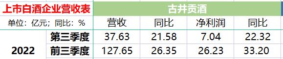 2022年第三季度,古井贡酒实现营业总收入37.63亿元,同比增长21.58%;归属于上市公司股东的净利润7.04亿元,同比增长19.27%;扣非净利润6.89亿元,同比增长22.32%。
