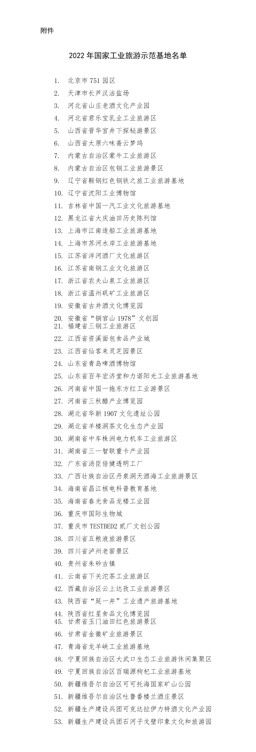 11月16日,文化和旅游部发布公告,北京市751园区等53家单位成为国家工业旅游示范基地。其中四川省五粮液旅游景区、江苏省洋河酒厂文化旅游区、四川省泸州老窖景区、安徽省古井酒文化博览园、山东省青岛啤酒博物馆、新疆生产建设兵团可克达拉伊力特酒文化产业园、广西壮族自治区丹泉洞天酒海工业旅游景区、河北省山庄老酒文化产业园、新疆维吾尔自治区吐鲁番楼兰酒庄景区在列(排名不分先后)。