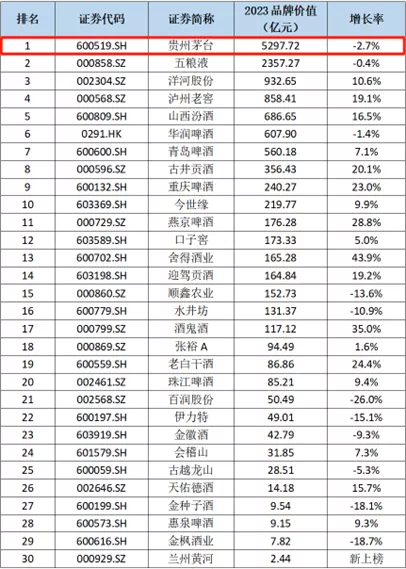 贵州茅台连续5年蝉联榜单第一,2023年的品牌价值为5297.72亿元,排在其后的是五粮液,品牌价值2357.27亿元,排名前十上市酒企还有洋河股份、泸州老窖、山西汾酒、华润啤酒、青岛啤酒、古井贡酒、重庆啤酒、今世缘。