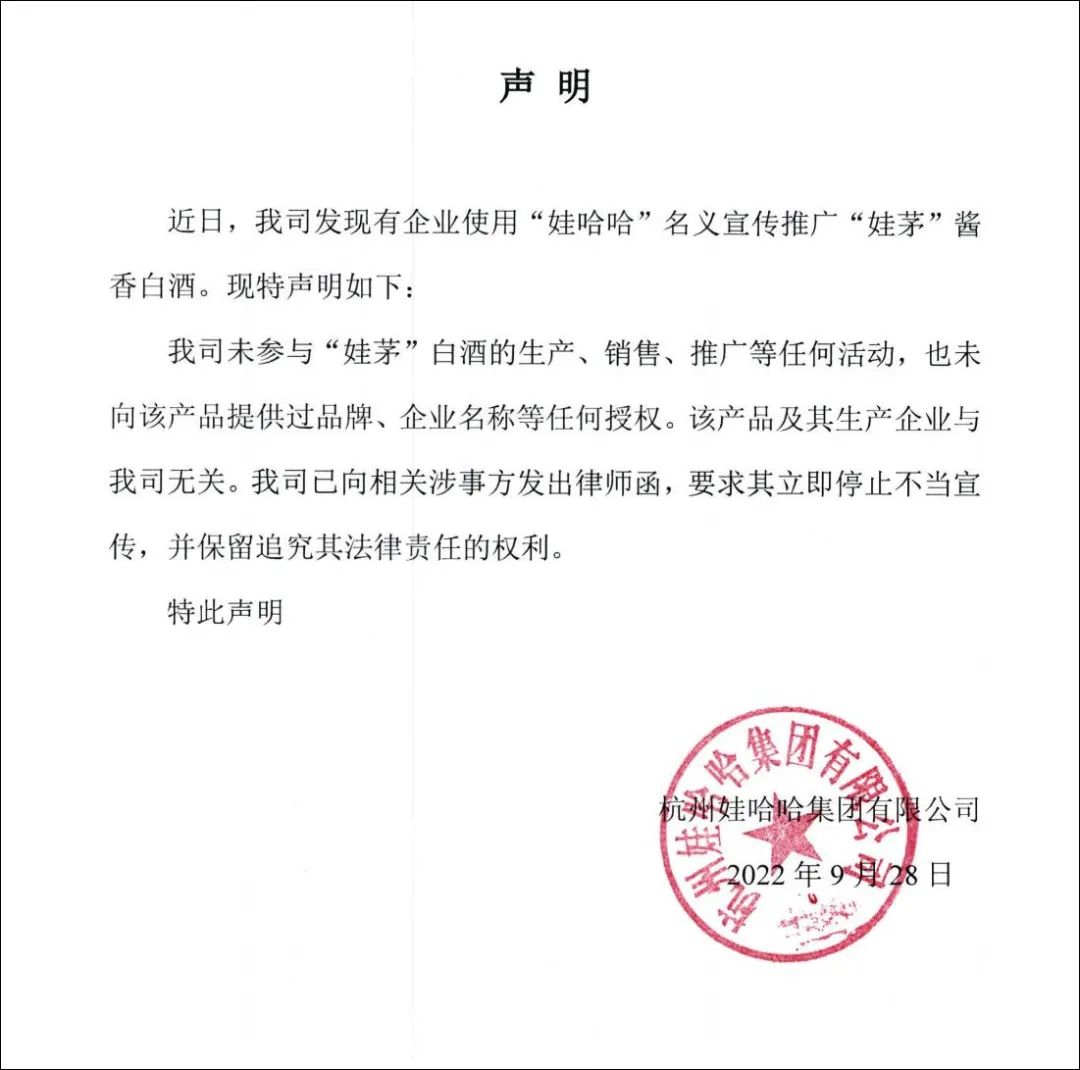 2022年9月25日,杭州娃茅酒业有限公司微信公众号发布了第一篇推文,海报显示:2016年娃哈哈投资成立宗盛智能,2022年宗盛智能投资成立娃茅酒业。随后,娃哈哈官网发布了一则声明:娃哈哈未参与“娃茅”白酒的生产、销售、推广等任何活动,也未向该产品提供过品牌、企业名称等任何授权。