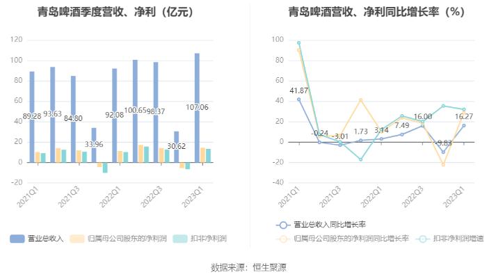 4月25日,青岛啤酒披露2023年第一季度报告。报告期内公司实现营业总收入107.06亿元,同比增长16.27%;归母净利润14.51亿元,同比增长28.86%;扣非净利润13.49亿元,同比增长32.07%;经营活动产生的现金流量净额为18.14亿元,同比增长94.29%;报告期内,青岛啤酒基本每股收益为1.071元,加权平均净资产收益率为5.53%。