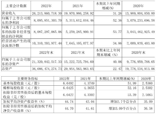 4月28日,山西汾酒披露2022年年度报告。2022年,公司实现营业总收入262.14亿元,同比增长31.26%;归母净利润80.96亿元,同比增长52.36%;扣非净利润80.87亿元,同比增长53.77%;经营活动产生的现金流量净额为103.10亿元,同比增长34.86%;报告期内,山西汾酒基本每股收益为6.6492元,加权平均净资产收益率为44.74%。公司2022年度分配预案为:拟向全体股东每10股派33.2元(含税)。