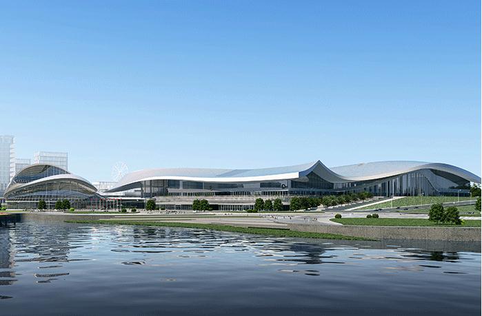 烟台八角湾国际会展中心位于烟台开发区八角街道,占地13.9万平方米,建筑面积24.6万平方米, 总投资约33亿元,由美国著名设计公司 AECOM根据第五代会展综合体定位设计,以“城岸云浪·海上云贝”为设计理念,将烟台的碧海与蓝天相接,海浪与白云相交融,再融入轻盈的银贝最终演化出建筑结构与造型相互统一、结构清晰的,集展览区、会议区和配套商业区为一 体的会展商业体。会展中心展览区分为室内展区和室外展区,室内共设有8个展厅,室内展览面积5.6 万平方米,总展位2800个;室外展览面积约3.3万平方米,可为各类会展活动提供展览空间。