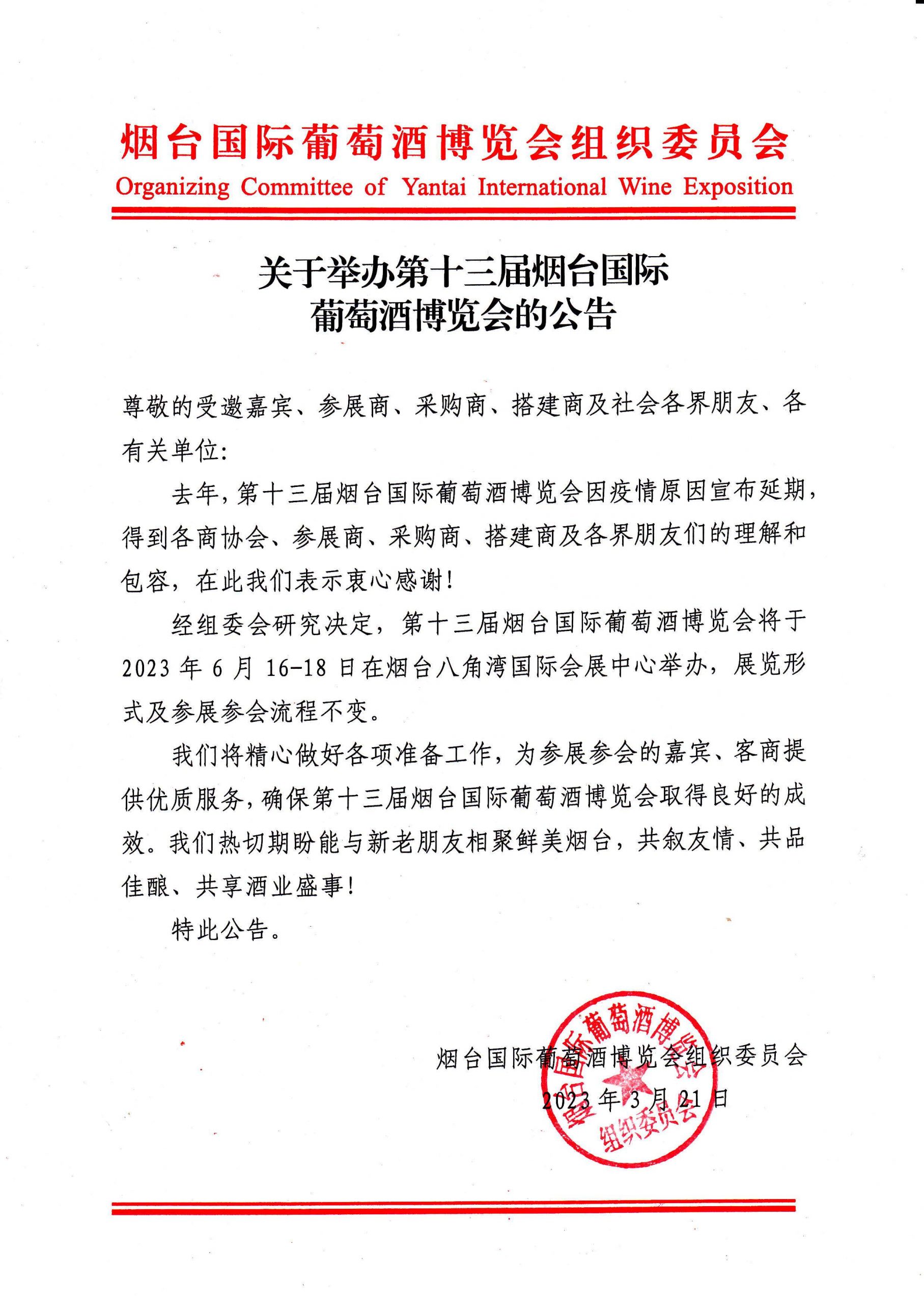 第十三届烟台国际葡萄酒博览会将于2023年6月16日-18日在烟台八角湾国际会展中心举办。