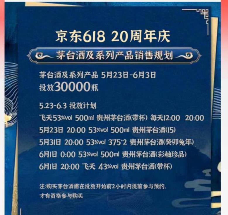 京东的投放量就比较清楚,数量明确30000瓶。京东的活动策略是,贵州茅台京东自营旗舰店从5月23日-6月3日投放30000瓶贵州茅台酒系列产品。