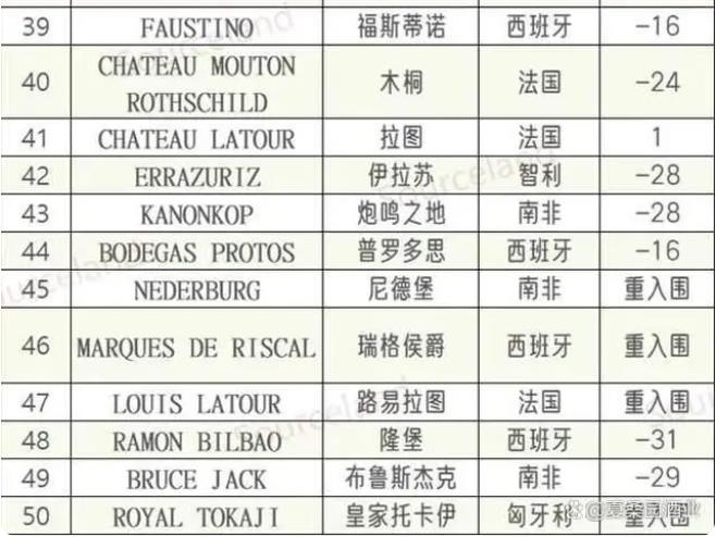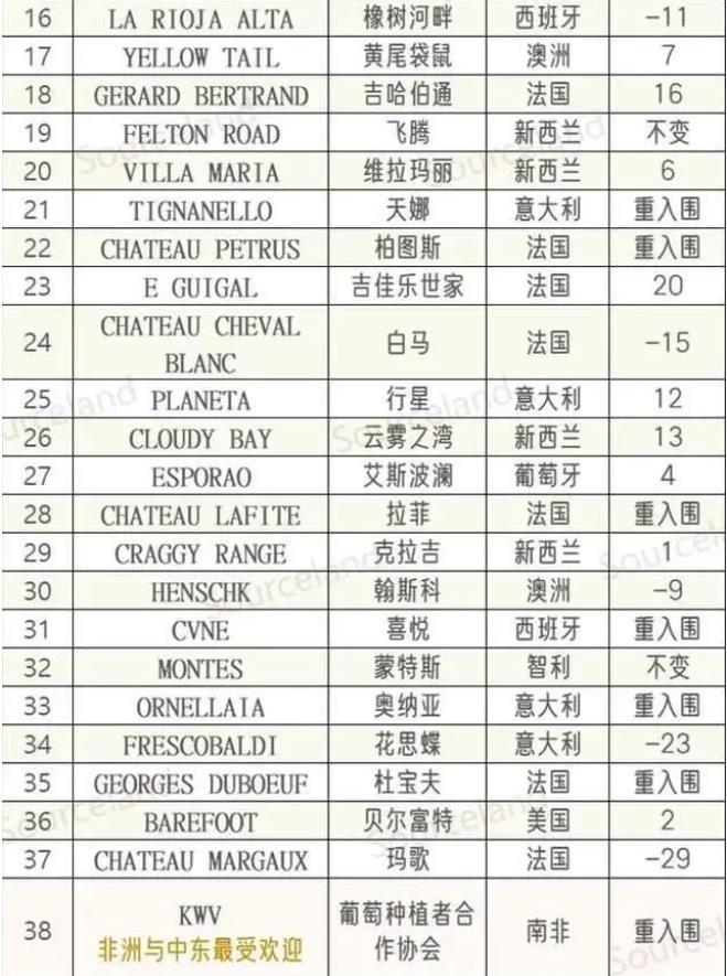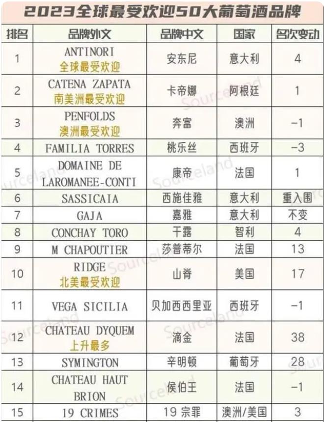 下面是今年(2023年)“全球最受欢迎的葡萄酒品牌”(The World’s Most Admired Wine Brands 2023)50个完整品牌名单。