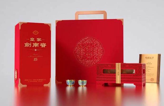 每套除了皇家剑南春酒以外,还包含一份“万寿无疆”限量礼盒、木质收藏证书,并配以一只精致的手提箱。礼盒创意源于文物“乾隆款剔红飞龙宴盒”,盒盖面雕飞龙,四壁开光装金丝网,可透视盒内,工艺繁复,雕刻精细,刀法流畅,是一件御用珍品。